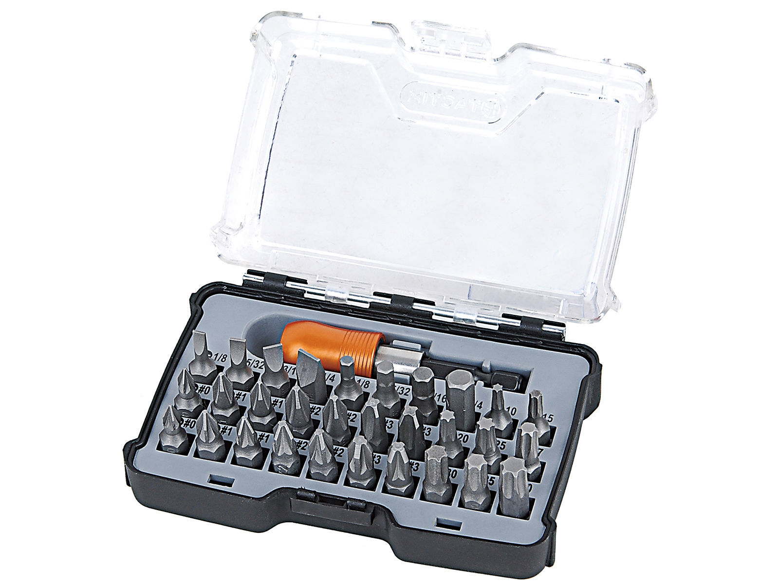 Bitssett i 31 deler i S2 kvalitet. Inkludert bitsholder med hurtigchuck. Bits 25mm: Flat: SL3, SL4.5, SL5.5, SL6.5, Philips: PH0, 2 x PH1, 2 x PH2, 2 x PH3, Pozi: PZ0, 2 x PZ1, 2 x PZ2, 2 x PH3, Sekskant: HX3, HX4, HX5, HX6, Torx: TX10, TX15, TX20, TX25, TX27, TX30, TX35, TX40.