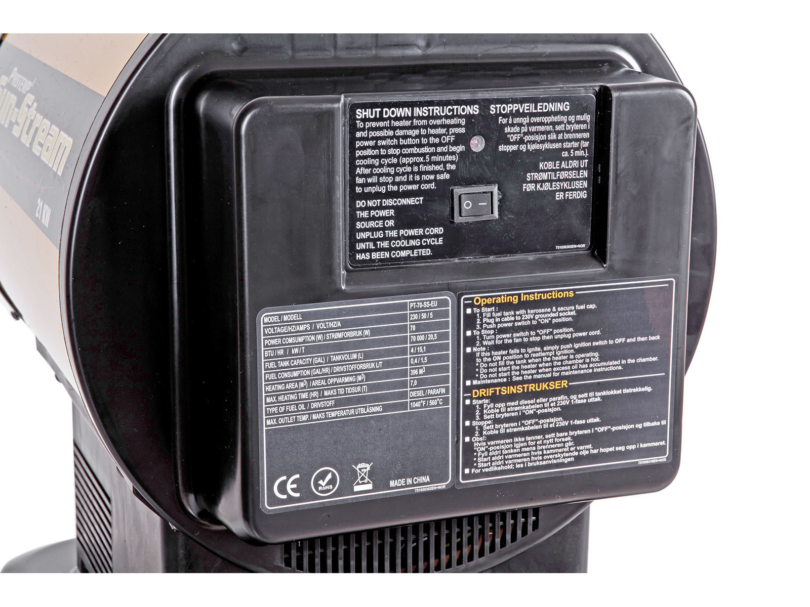 Bærbar strålevarmer som kan drives av både diesel og parafin. Strålevarmeren er spesielt godt egnet for oppvarming og tørking i mindre areal, i verksteder, tørking etter lekkasjer, i nybygg o.l. Meget effektivt forbrenningsystem, og byggtørken/strålevarmeren er utstyrt med flere sikkerhetssystemer. • Støysvak, stillegående vifte • Innebygd, kalibrert lufttrykkmåler • Innebygd sikkerhetstermostat • Automatisk avstengningssystem for økt sikkerhet • Overopphetingsvern og flammevokter Videre er byggtørken utstyrt med : • Bærehåndtak • Av/på-bryter • Drivstoff tankmåler • Ledning med stikkontakt