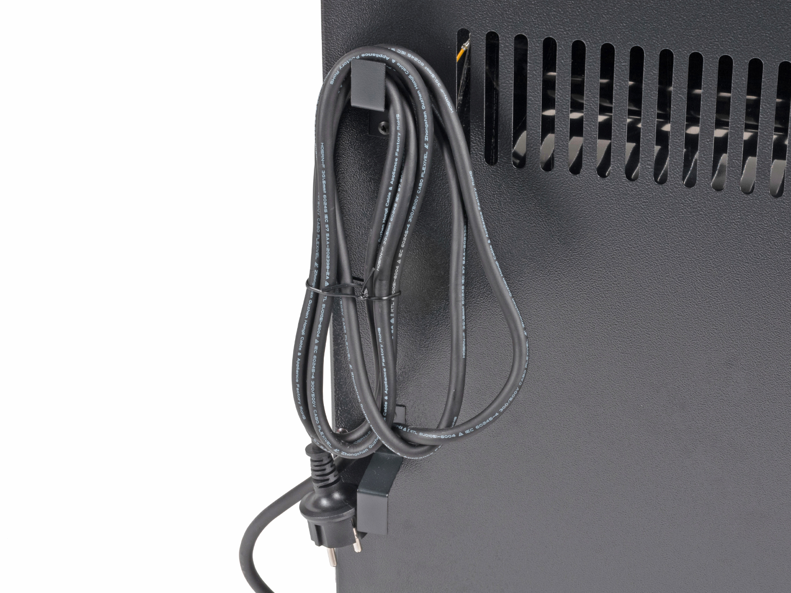 Den 3 meter lange strømledningen kan henges opp på praktiske ledningsbraketter på baksiden av varmeren når den ikke er i bruk. Varmeren har beskyttelsesklasse IPX4 og tåler derfor vannsprut. Den er utrustet med veltesikring som slår av varmeren om den skulle velte.