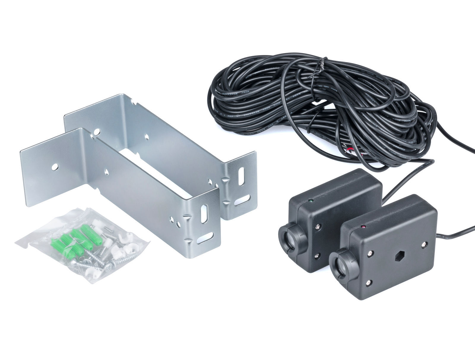 Med ledning.  Brytes lysstrålen mellom sensorene på grunn av at gjenstander blokkerer, vil ikke garasjeportåpneren lukke før hinder er fjernet.