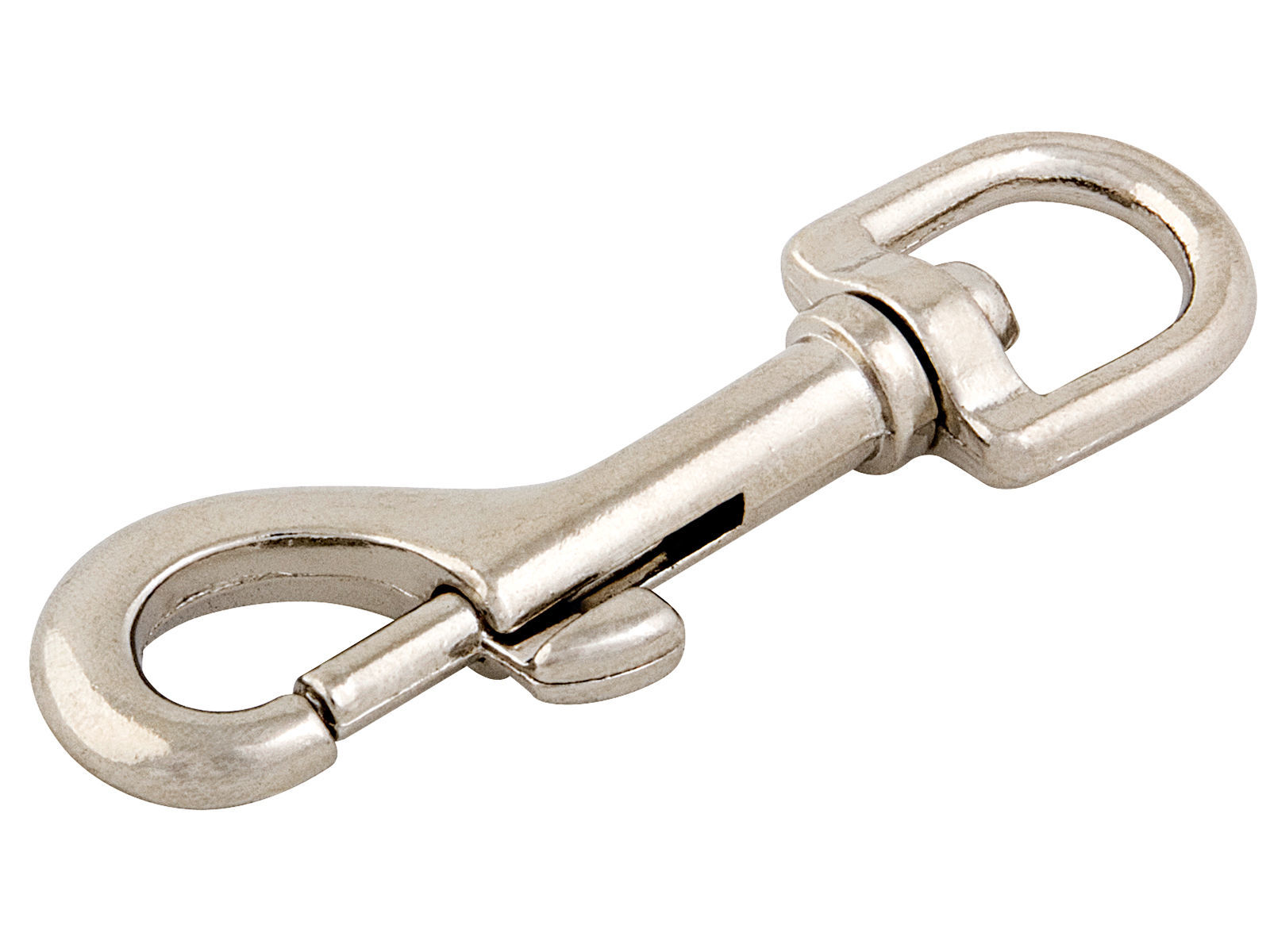 Karabinkrok med svivel brukes for sammenkoblinger med øyekroker/ringer osv. Produsert av Zamak med forniklet overflatebehandling. Leveres med 10 mm åpning og svivel Ø14x12 mm.