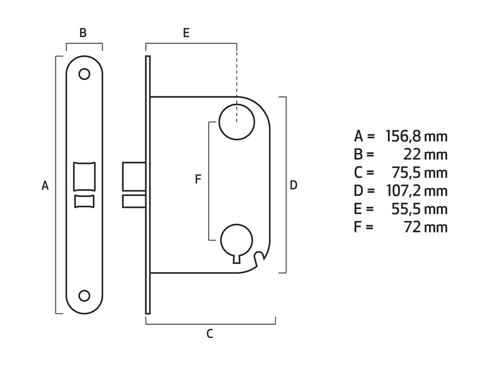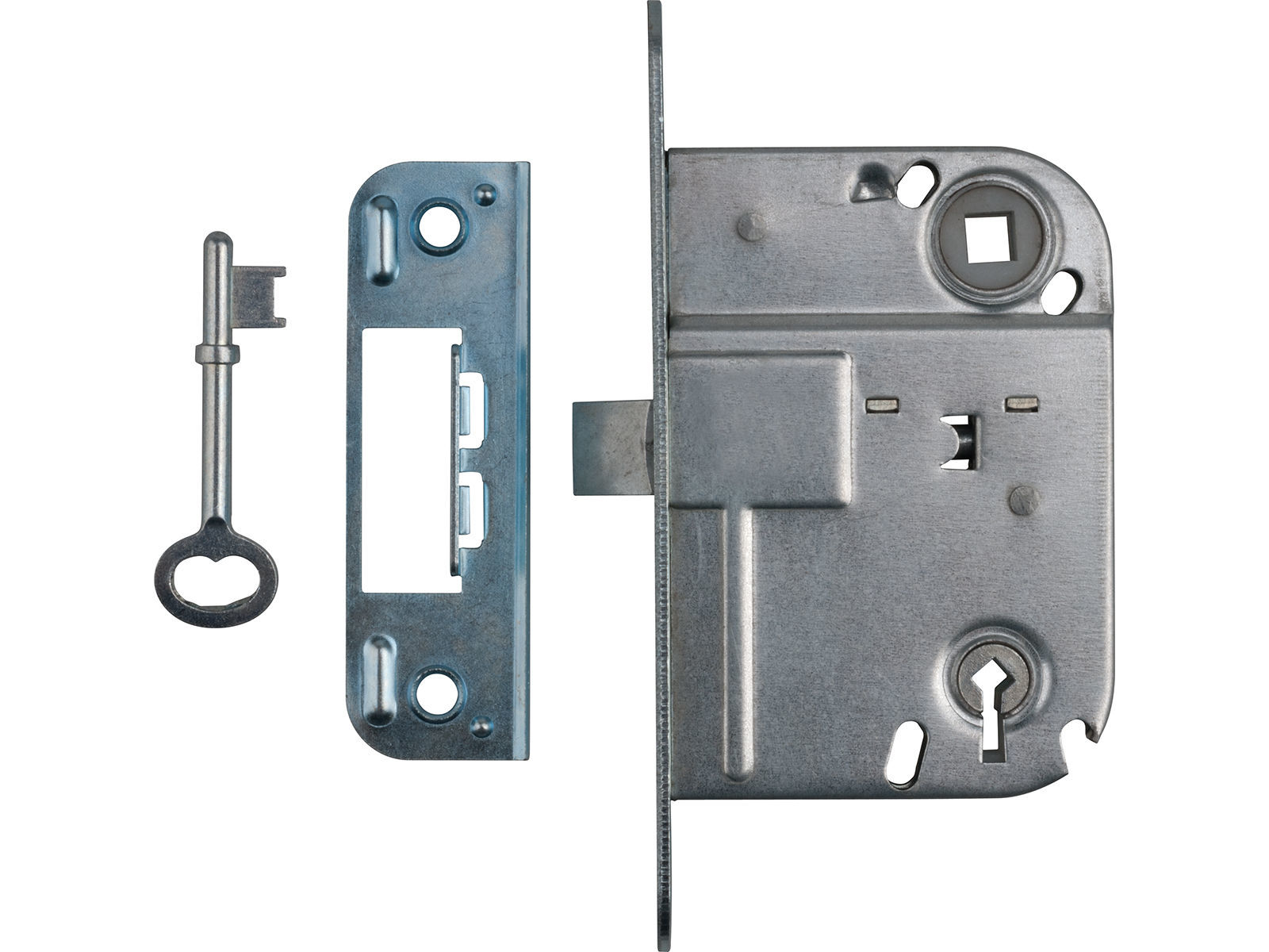 Låskasse for innvendige lettdører som betjener låsreilen med nøkkel. Elforsinket utførelse. Slagretning endres ved å trekke ut vriderfallen og vri den 180 grader. Leveres med nøkkel nr 5 og sluttstykke. WC-garnityr kan også benyttes på denne låskassen.