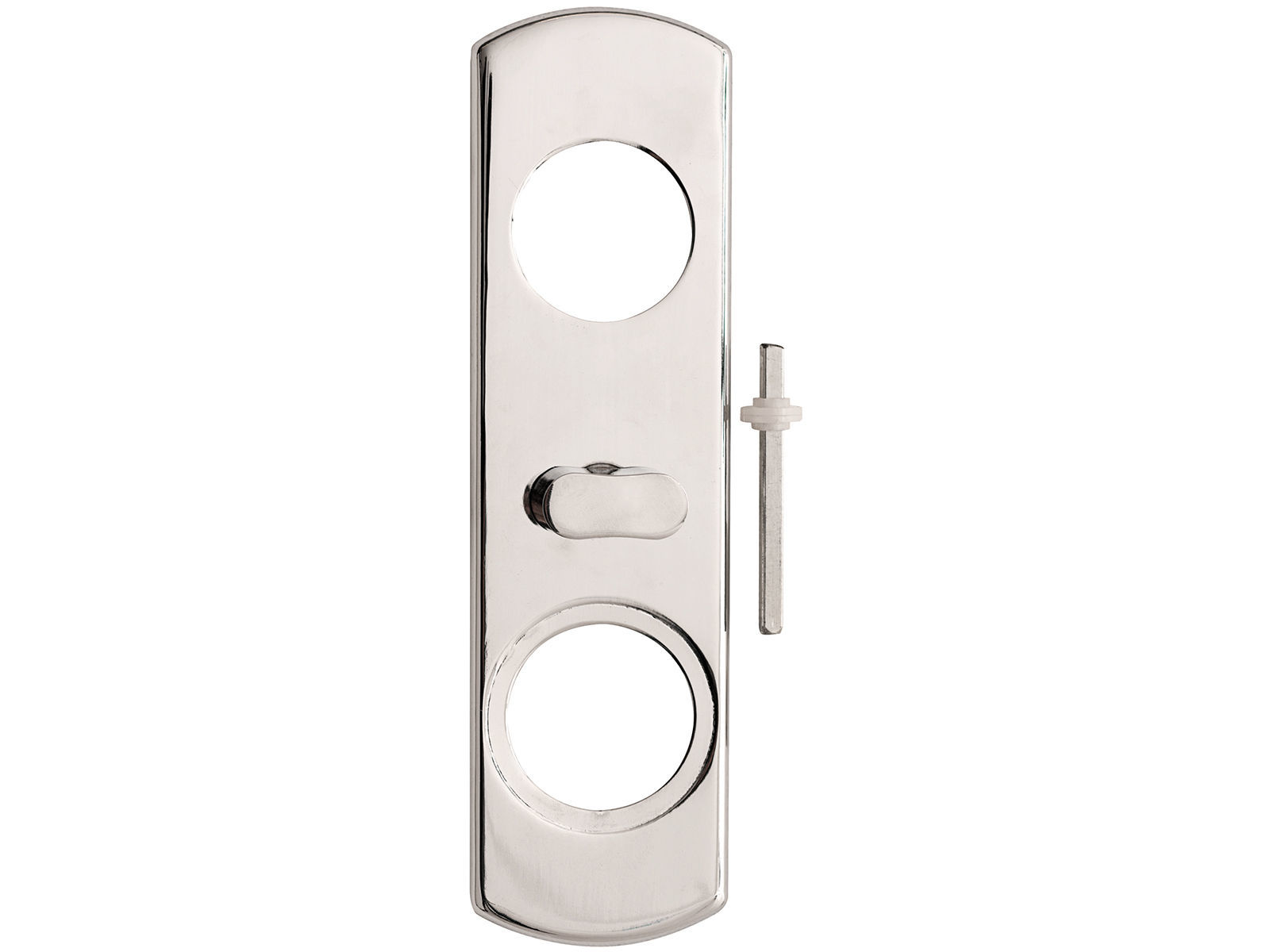 Langskilt med knappvrider. Beregnet for ytterdører, og er tilpasset låskasse 72002 eller låskasser med lignende funksjon (2002). Forpakningen inneholder 1 par langskilt og 1 stk knappvriderpinne med stoppskiver.