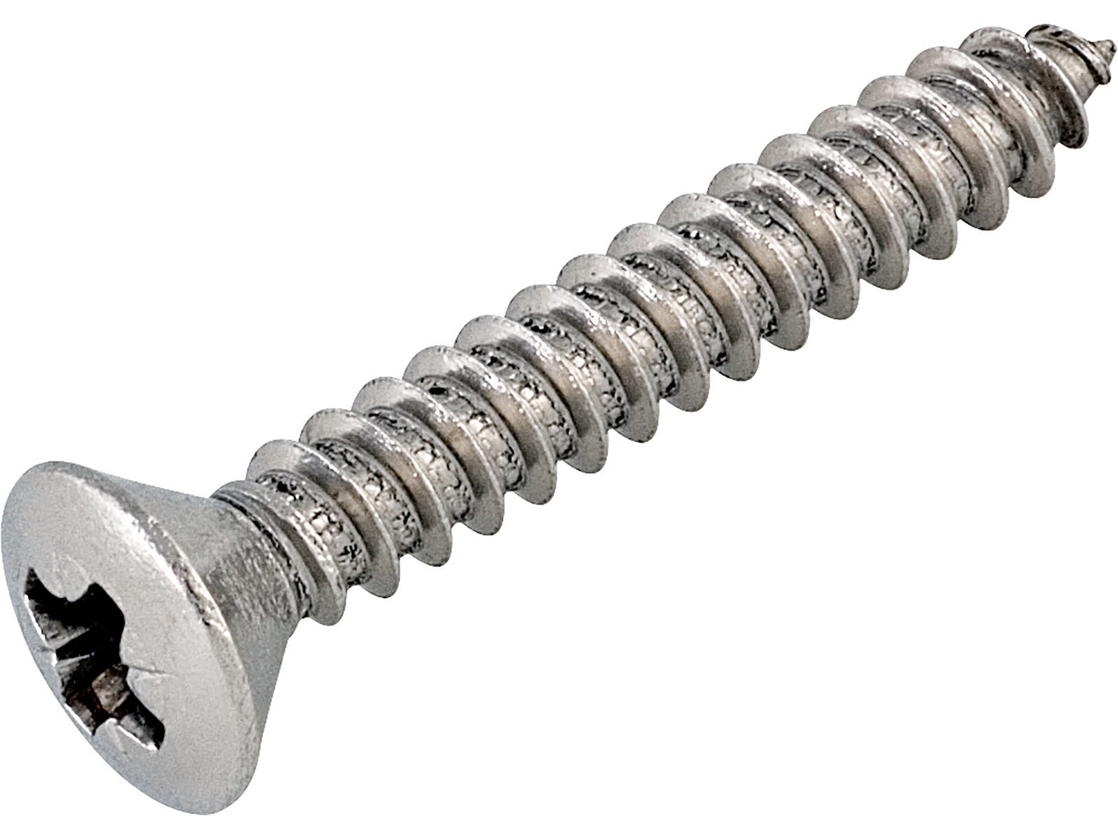 Skrue beregnet for montering i tre, stål og glassfiber osv. Selvgjengende skrue som brukes til å forbinde tynne plater. Produsert av rustfritt materiale i syrefast A4 kvalitet. Skruen har Pozidrive-spor.