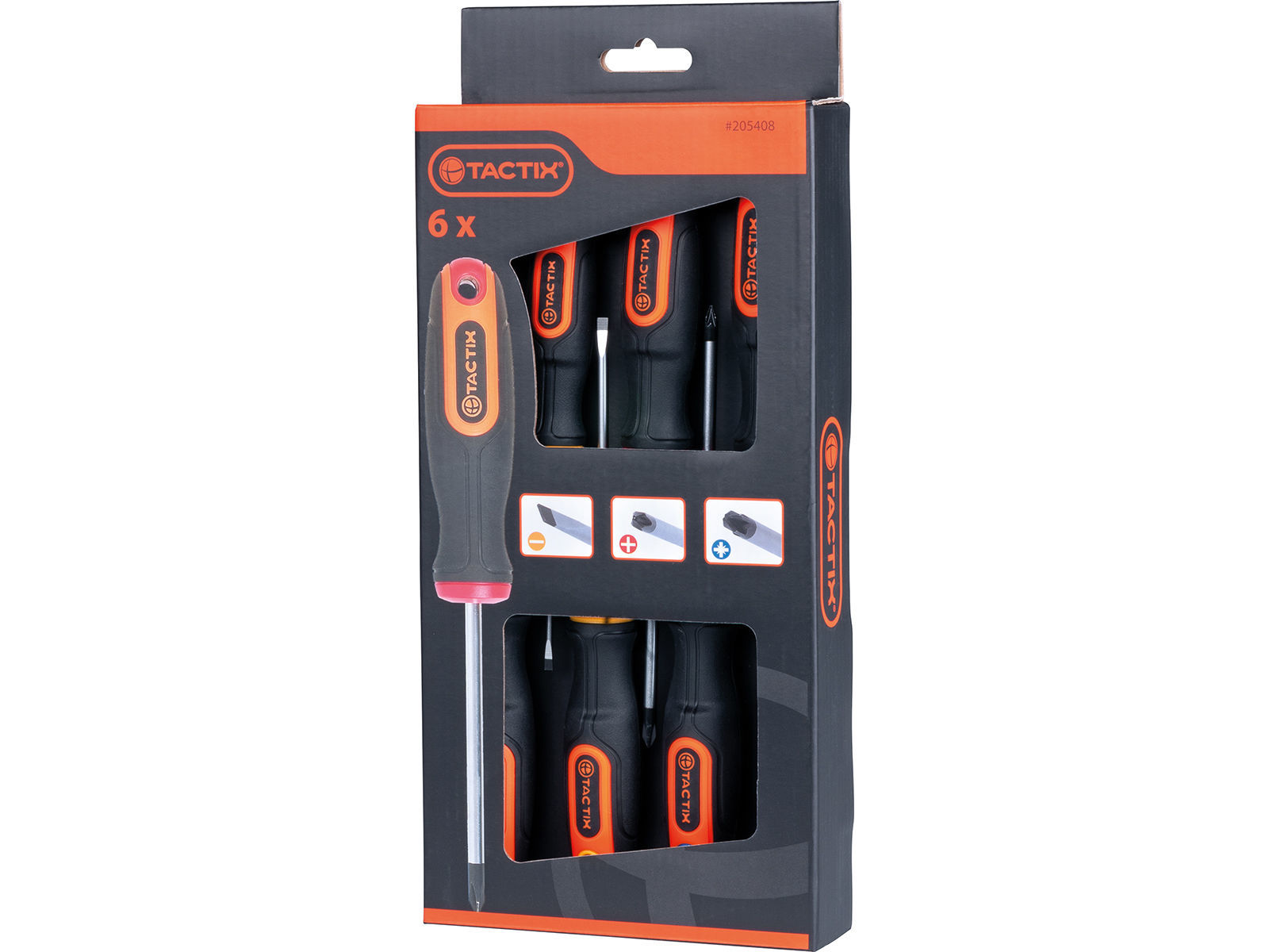 6 delers sett med klinger av S2 kvalitetsstål med magnetisert spiss. Ergonomisk og gripevennlig grep. Settet inneholder flat 3x100 - 4x100mm, PH1x100mm - PH2x125mm, PZ1x100 - PZ2x125.