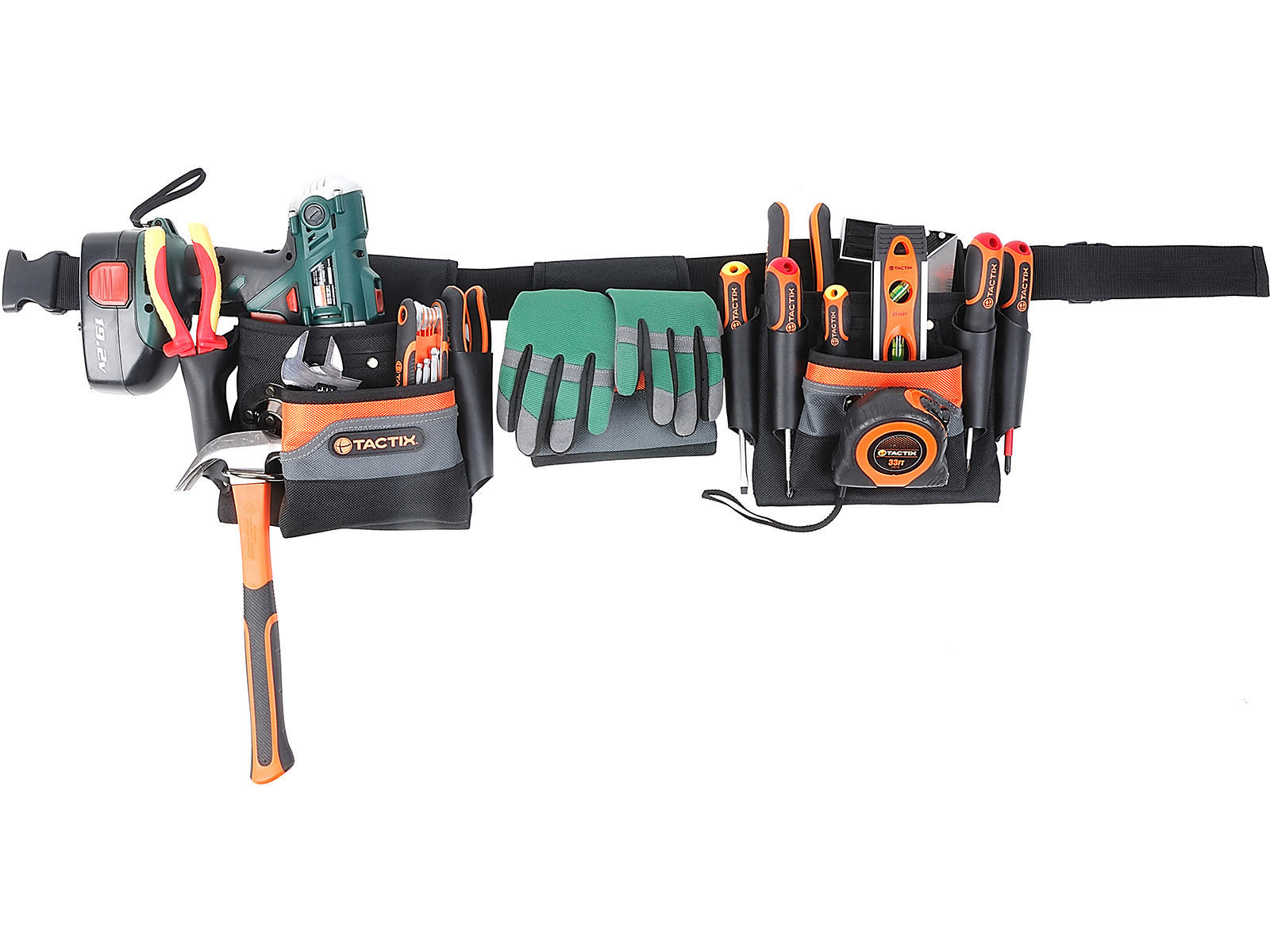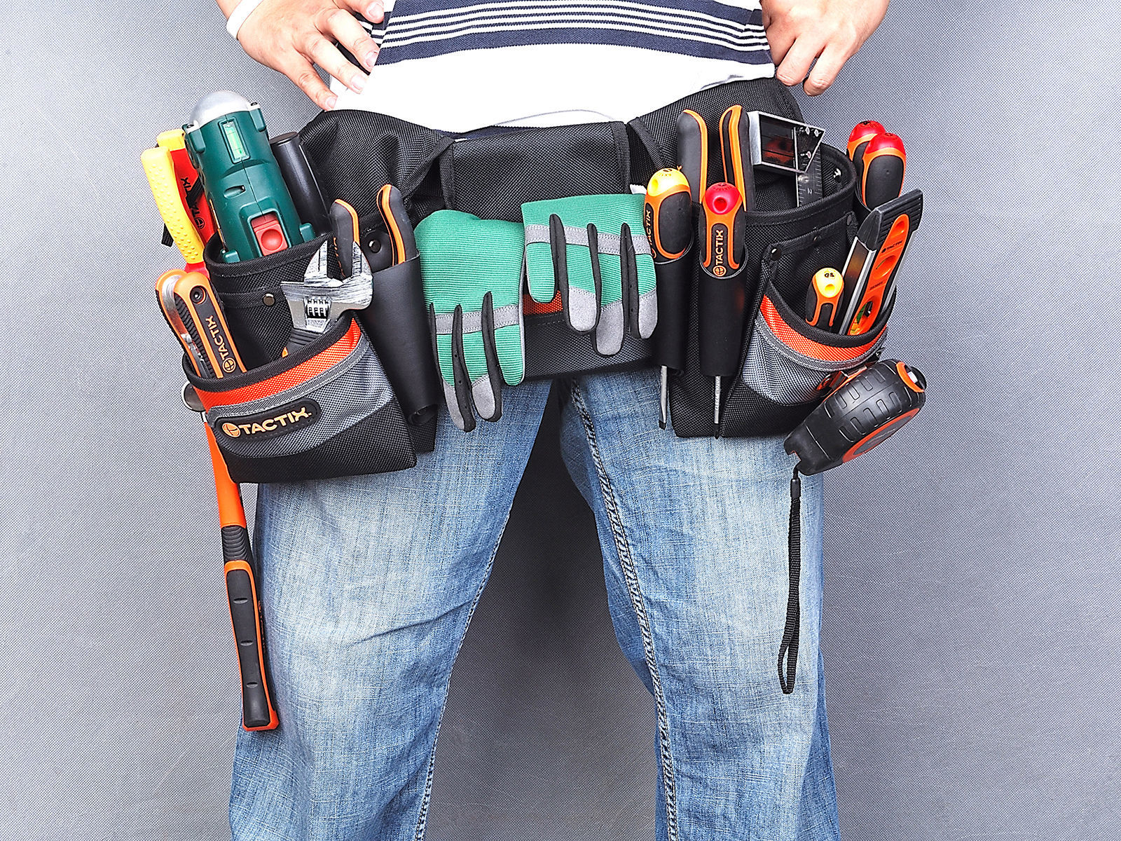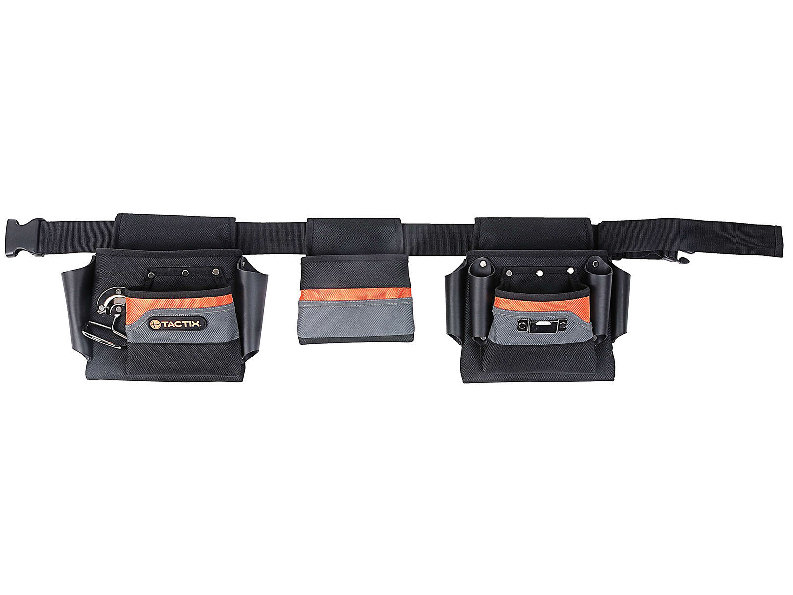Kraftig snekkerbelte i nylon med 5 rom og 6 skinnhylster for oppbevaring av verktøy. Regulerbar lengde: maks 110cm.