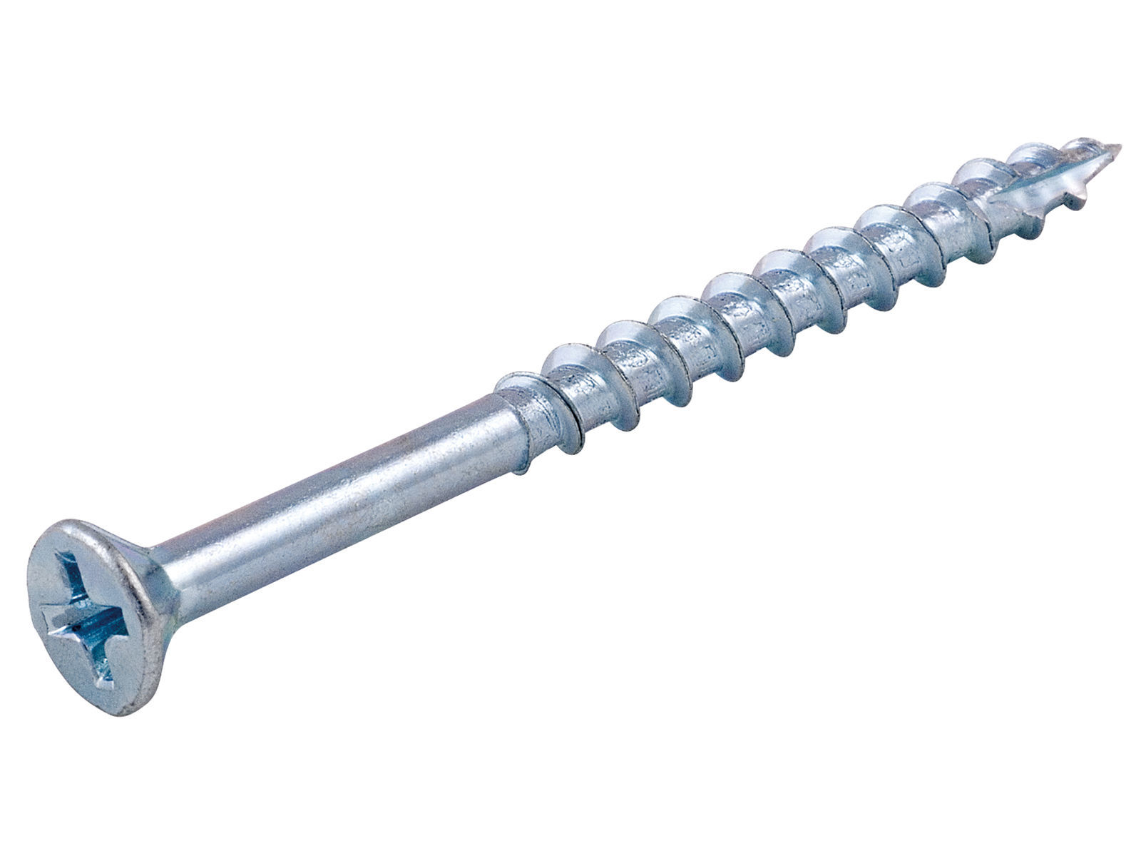 Skrue beregnet for montering av sponplate. Produsert av herdet stål med elforsinket overflatebehandling. Rillespor under hodet sørger for at skruen forsenkes godt i underlaget.