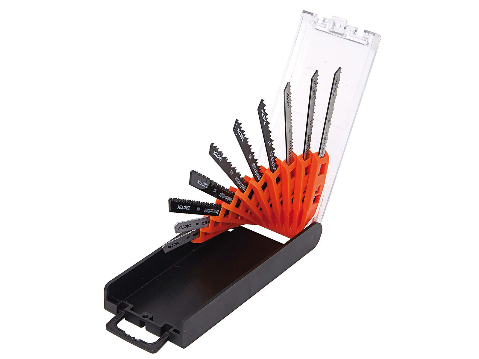 Stikksagbladsett med U-feste. Inneholder: (Tre) 3 x 100mm - 10TPI, 2 x 100mm - 8TPI, 3 x 100mm - 6TPI / (Metall) 1 x 75mm - 21TPI og 1 x 75mm - 12TPI