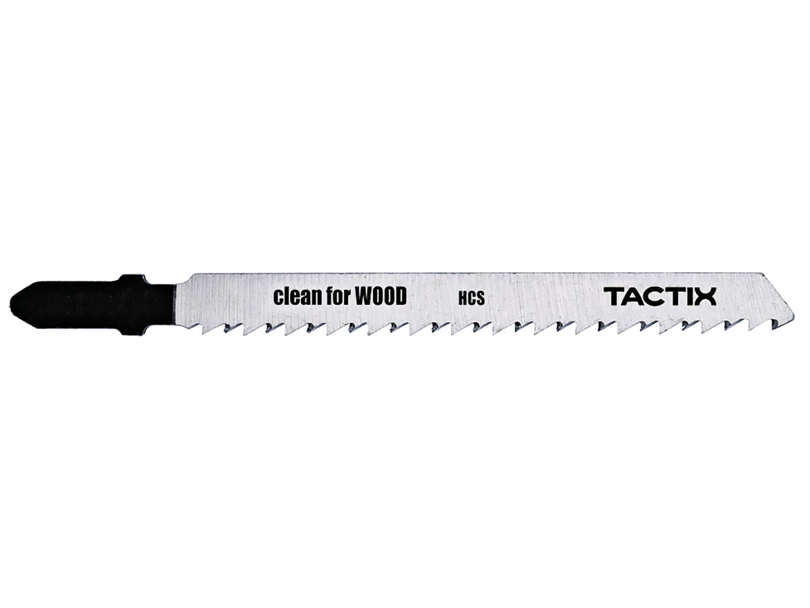 Clean for Wood stikksagblad lager rene rette kutt i tre. Blad av høykarbonstål som er egnet for å kutte mykt treverk og ikke-slipende trearbeidsmaterialer. Det har fin progressiv tannavstand (2,5 mm) for kutting i trematerialer med en tykkelse på 3-30 mm. T-feste.