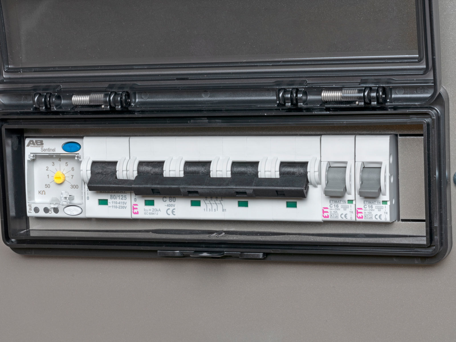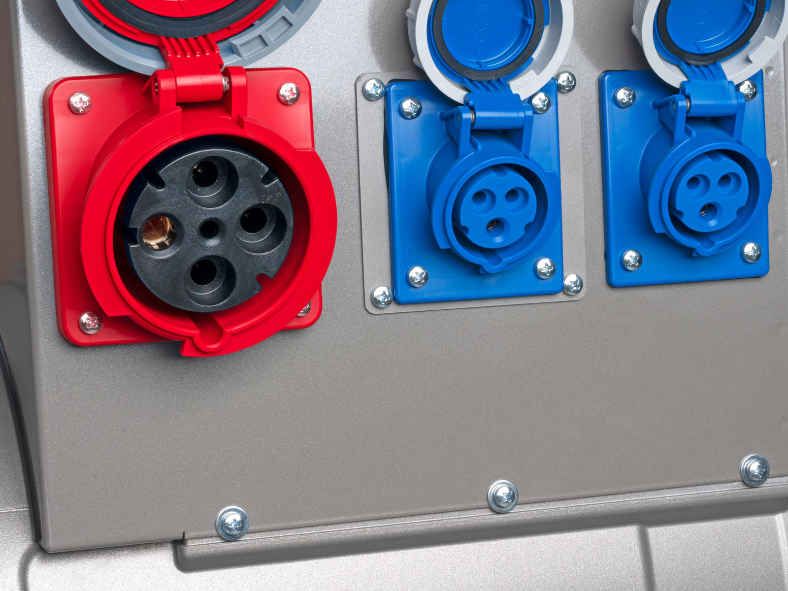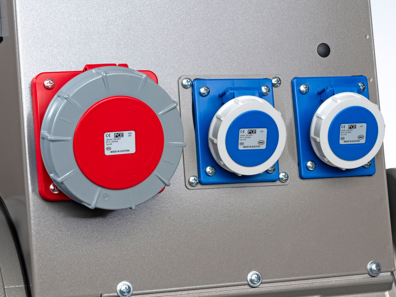 Aggregatet er utstyrt med AVR (automatisk spenningsregulering), voltmeter, amperemeter, frekvensmåler, timeteller, ett 3-fase strømuttak (400V, 63A), to 1-fase strømuttak (230V, 16A) og sikringer for alle kurser.  Videre leveres generator og panel i sprutsikker utførelse (IP44).