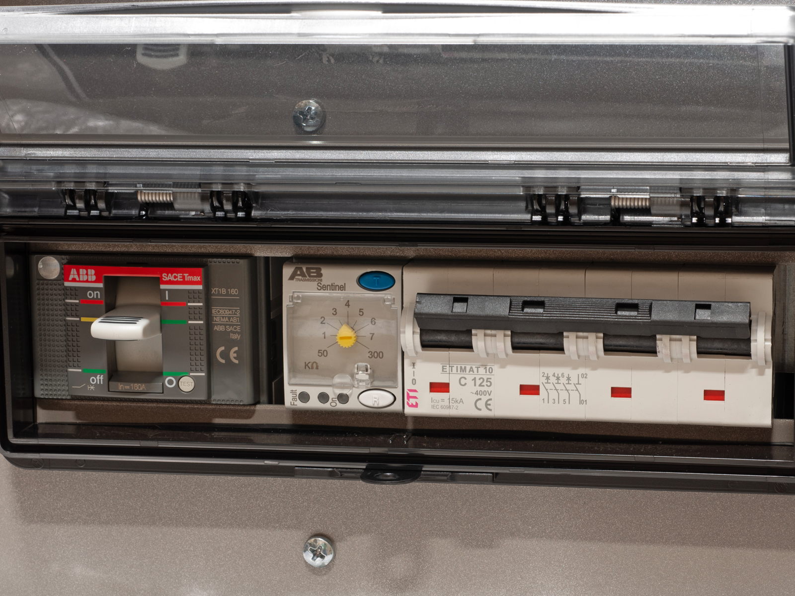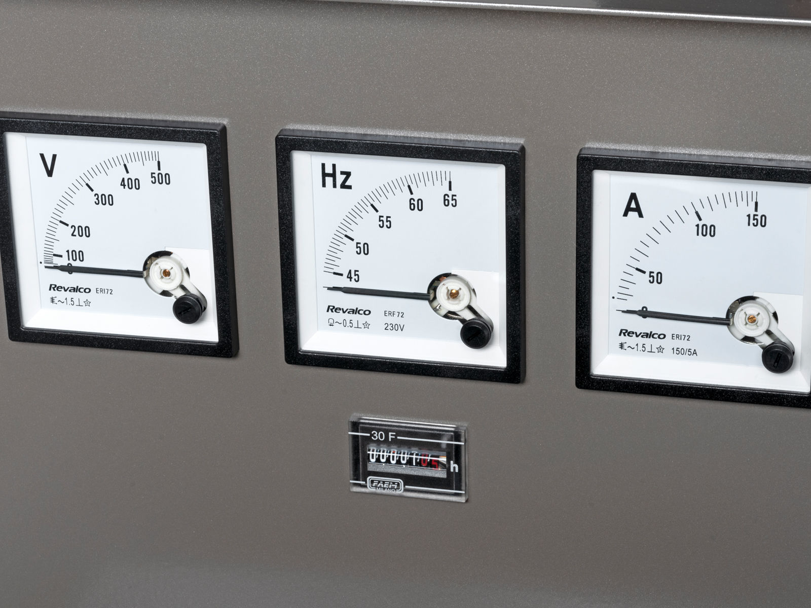 Aggregatet er utstyrt med AVR (automatisk spenningsregulering), voltmeter, amperemeter, frekvensmåler, timeteller, ett 3-fase strømuttak (230V, 125A), to 1-fase strømuttak (230V, 16A) og sikringer for alle kurser.