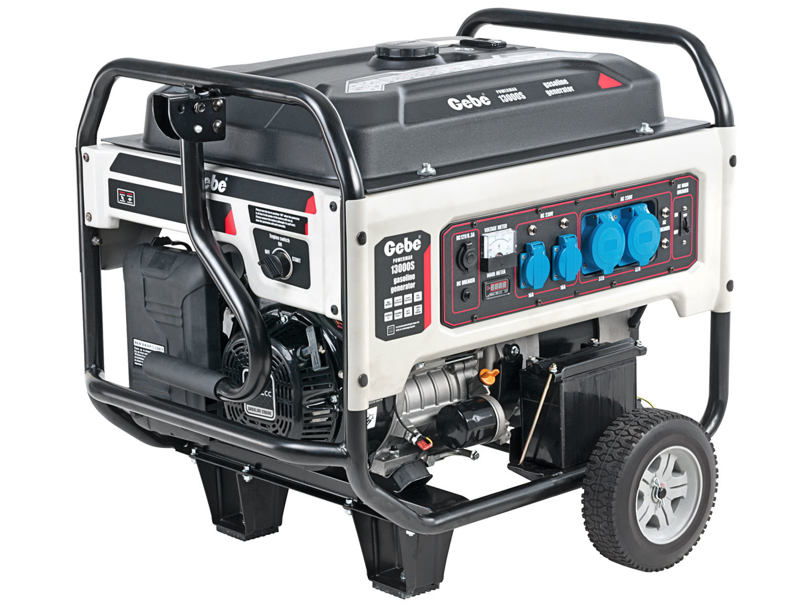 Profesjonelt bensindrevet strømaggregat med lettstartet og kraftig motor på hele 25 HK og generator med 1-fase strømuttak (230V, 1-fase). Maksimal effekt er 9,5 kW (1-fase). Motor og generator er sammenbygd i kraftig, vibrasjonsdempende ramme som er utstyr med hjul og kraftig transport- og løftebøyle. Videre er aggregatet utstyrt med AVR (automatisk spenningsregulering), voltmeter, frekvensmåler, automatsikringer, timeteller, indikasjonslamper, batterilader 12V, oljevakt og 48 liters tank som gir ca. 15 timers driftstid ved 50% belastning. Aggregatet har to 16A, 1-fase strømuttak og to 32A, 1-fase strømuttak.