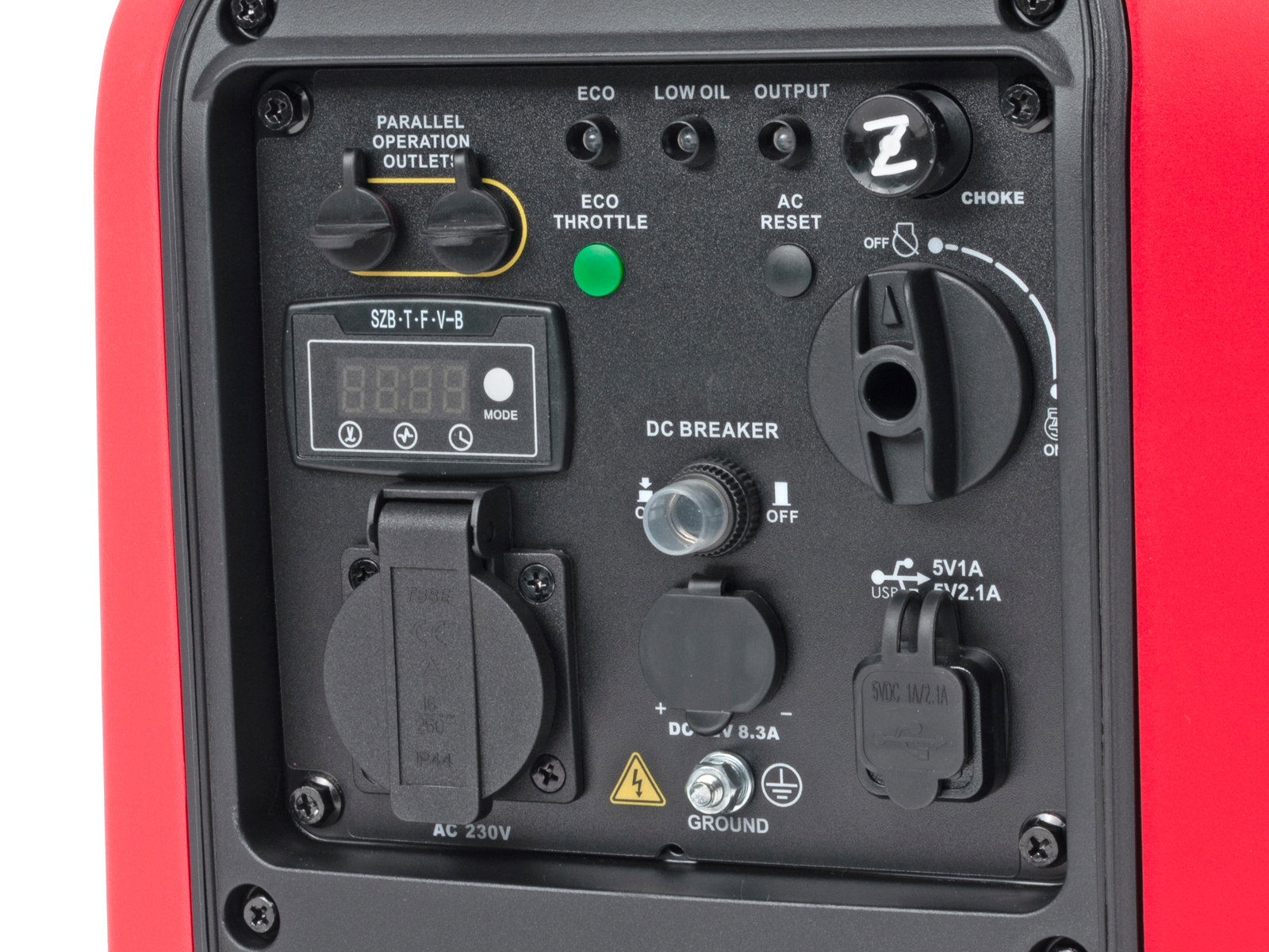 Aggregatet leveres videre med en rekke sikkerhetsfunksjoner; AVR (automatisk spenningsregulering), indikasjonslamper, oljevakt og en 4-takts bensinmotor med automatisk trinnløs hastighetskontroll tilpasset belastning, noe som gir ca 20% lavere drivstofforbruk.
