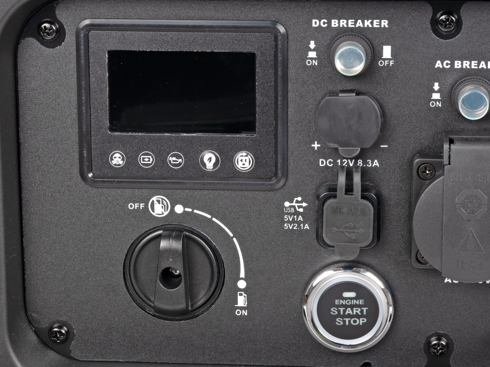 Aggregatet leveres videre med en rekke sikkerhetsfunksjoner; AVR (automatisk spenningsregulering), digitalt display som viser spenning og frekvens, oljevakt og en 4-takts bensinmotor med automatisk trinnløs hastighetskontroll tilpasset belastning, noe som gir ca 20% lavere drivstofforbruk.