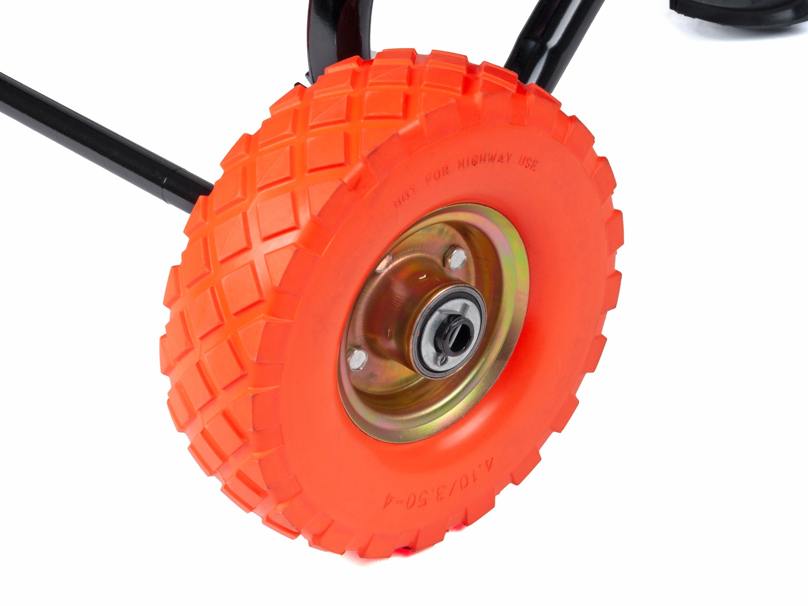Leveres med kraftig, mønstret slangeløst dekk foran, og 2 stk støttehjul bak.