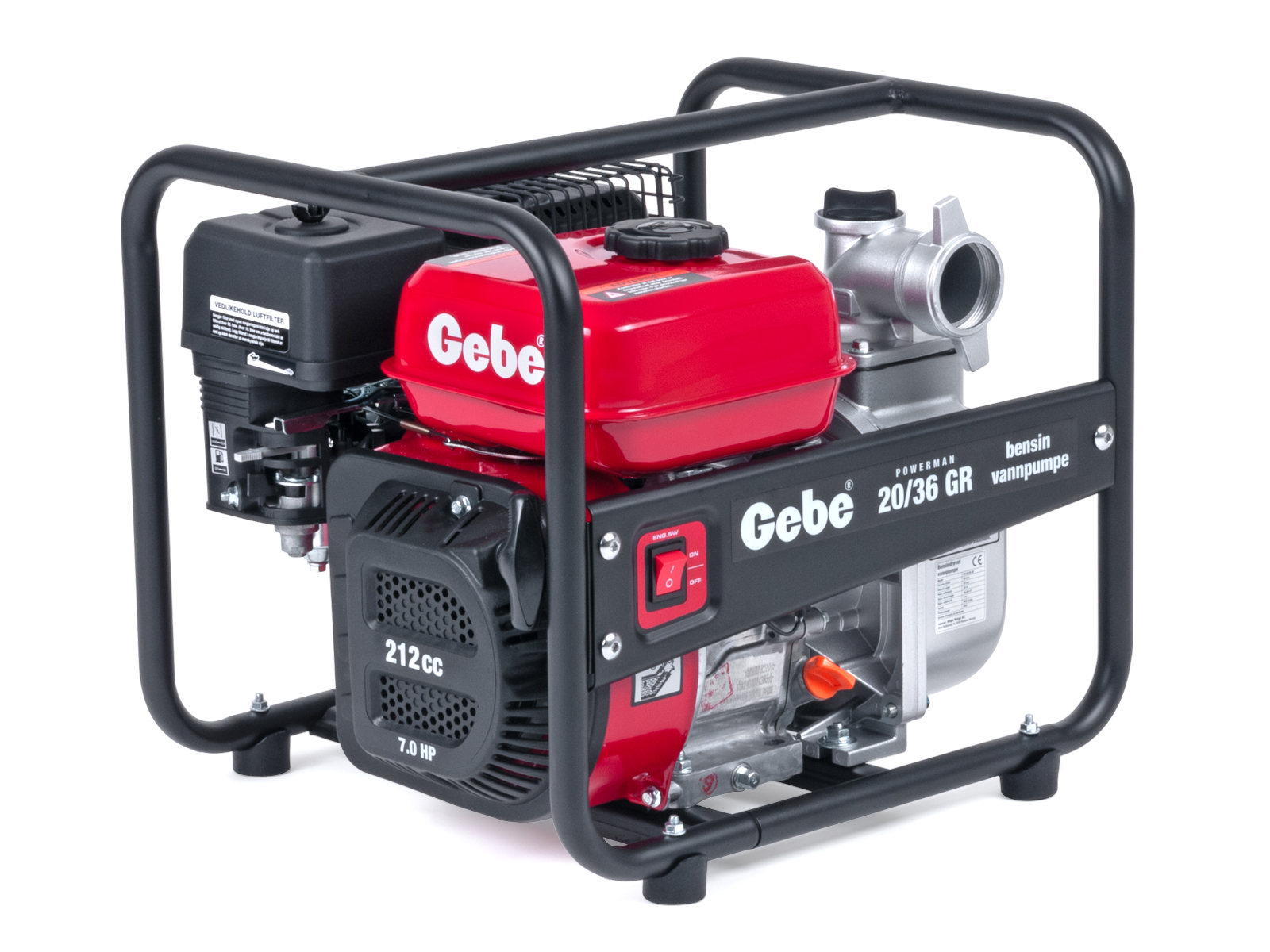 Vannpumpen har maks. leveringskapasitet på 600 l./min. Pumpens sugeside og trykkside har 2" (50 mm) tilkobling, og pumpen leveres med to 50 mm (2") slangestusser, bunnsil og slangeklemmer.