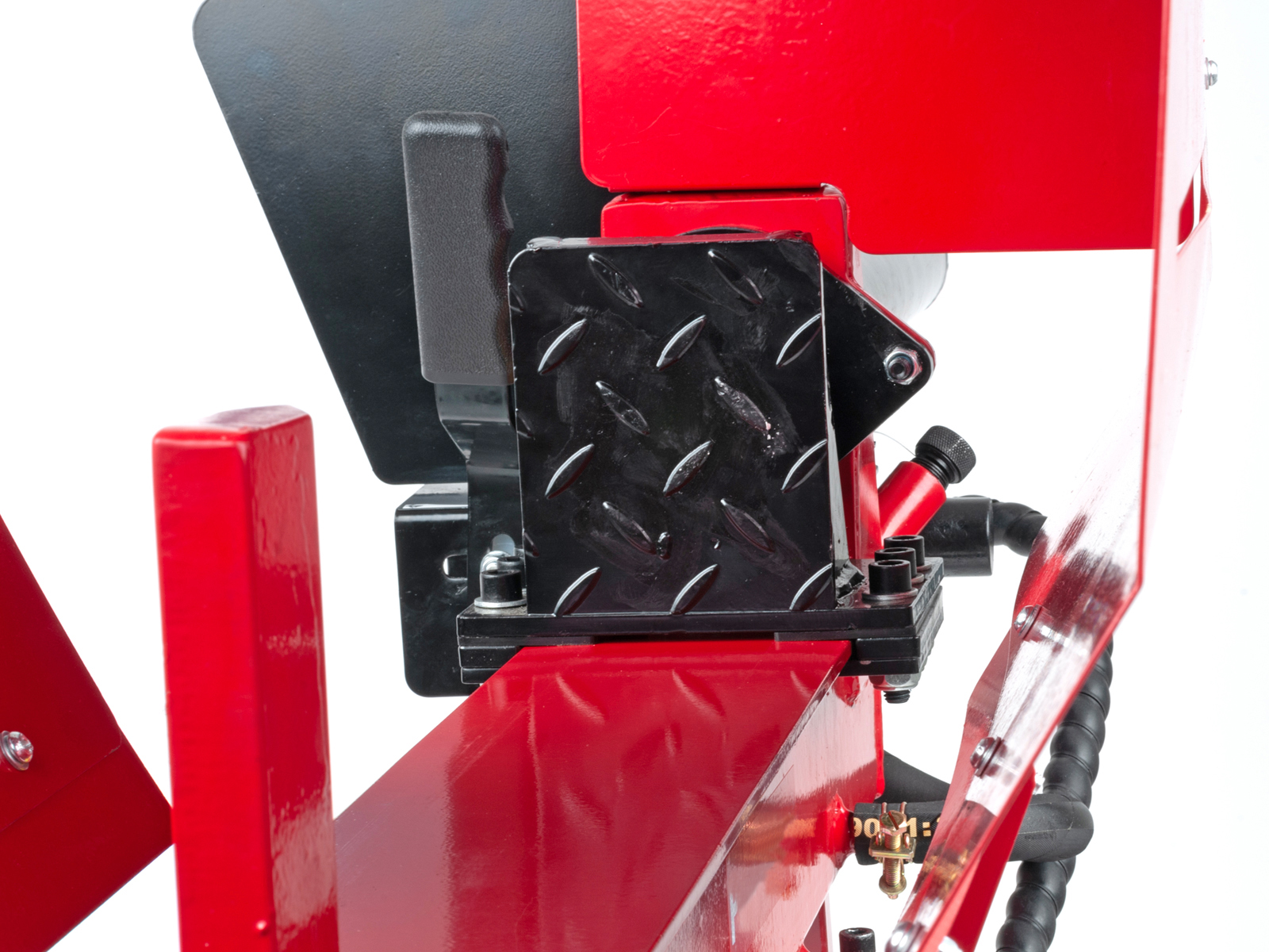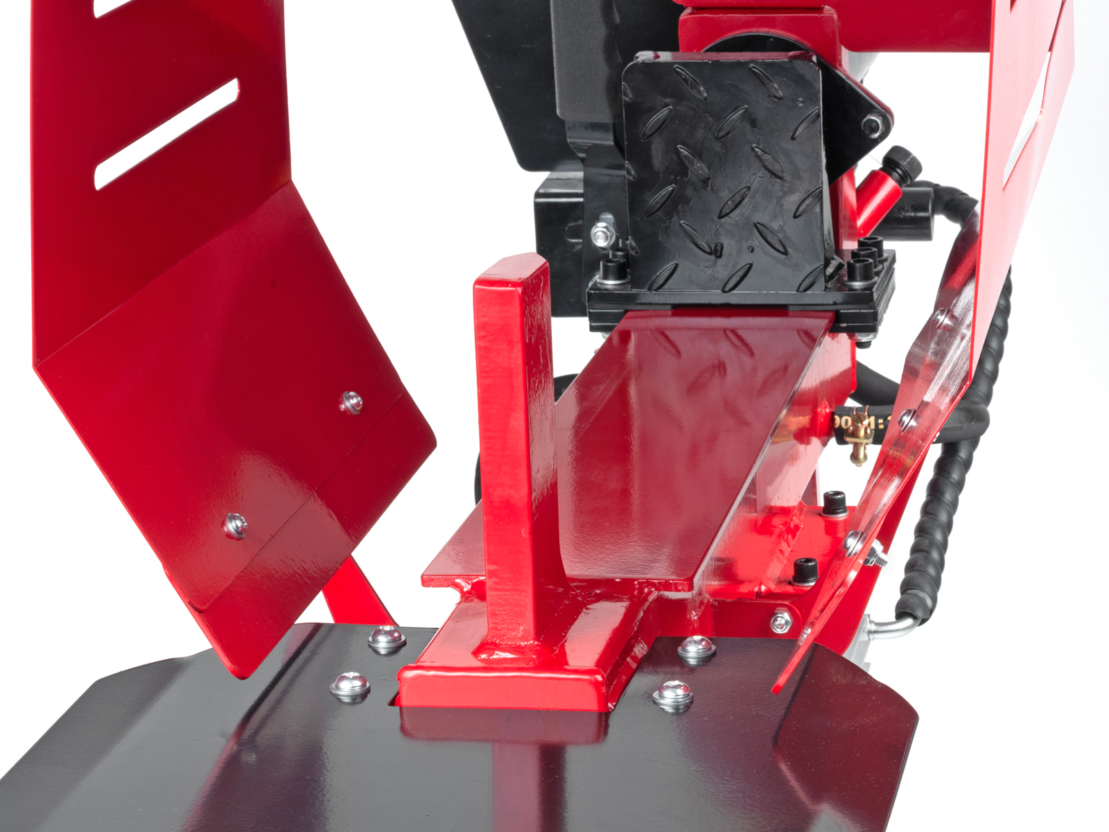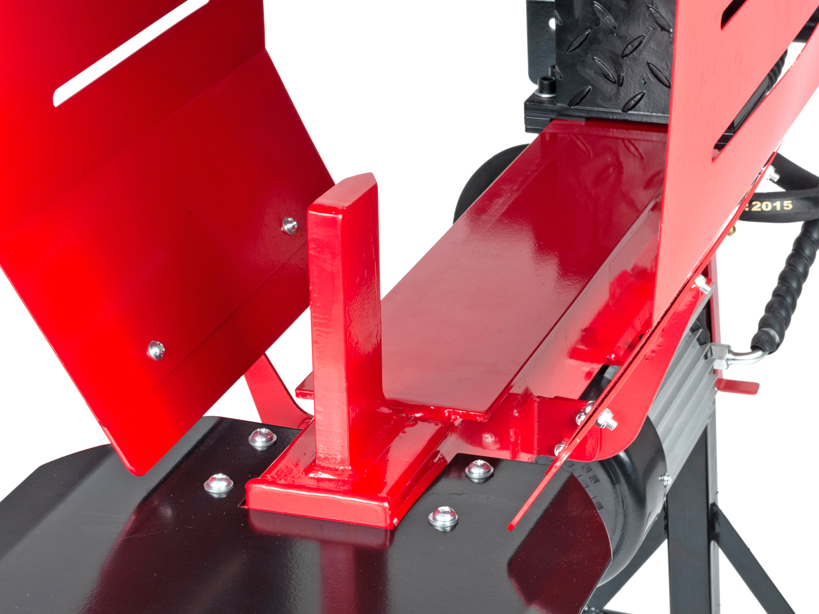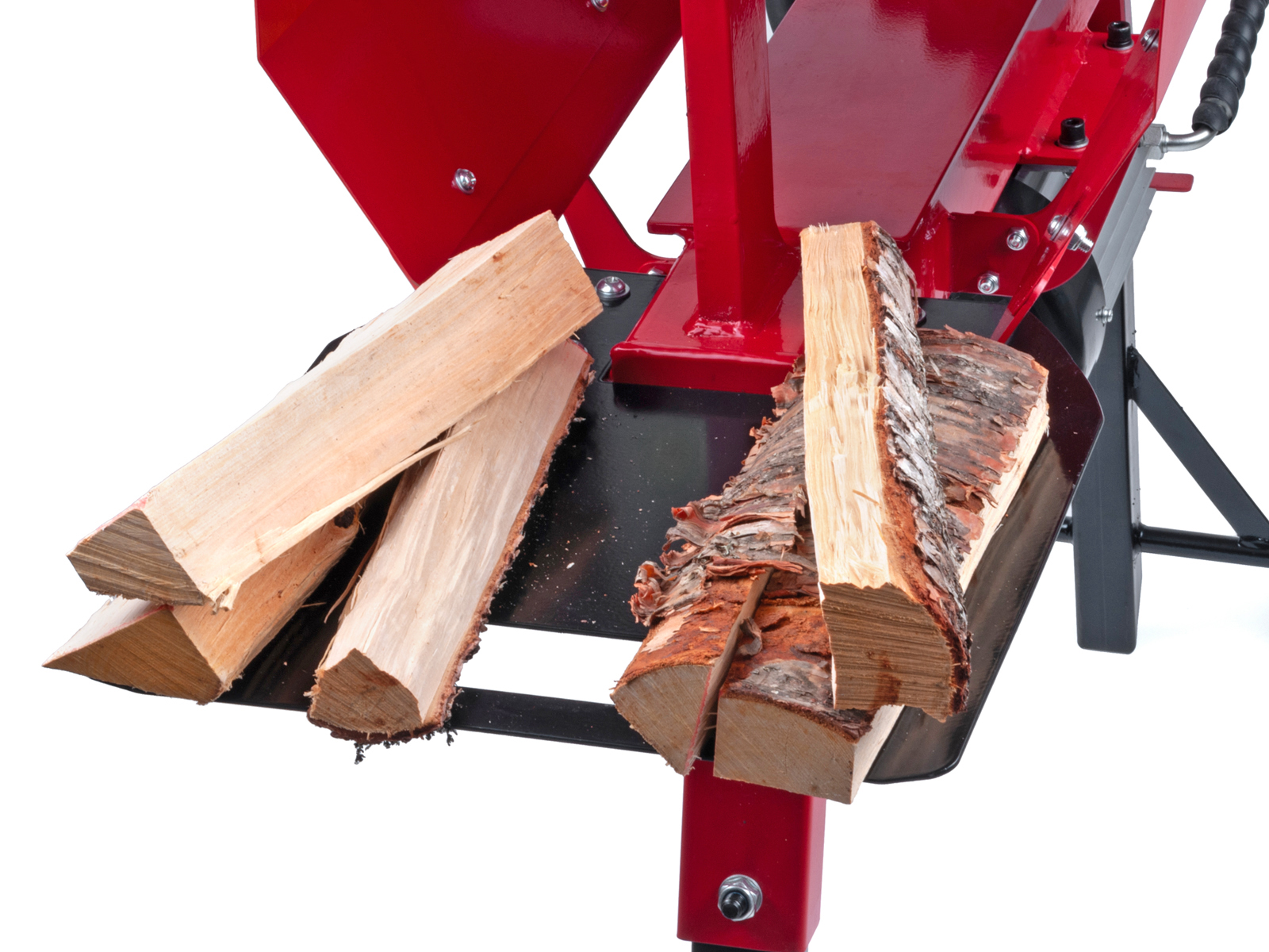 Vedkløveren er utstyrt med høyt stativ, noe som gir en optimal og ergonomisk arbeidshøyde. Videre er vedkløyveren utstyrt med hjul for enklere transport, og nødstoppbryter som frakobler strøm umiddelbart.
