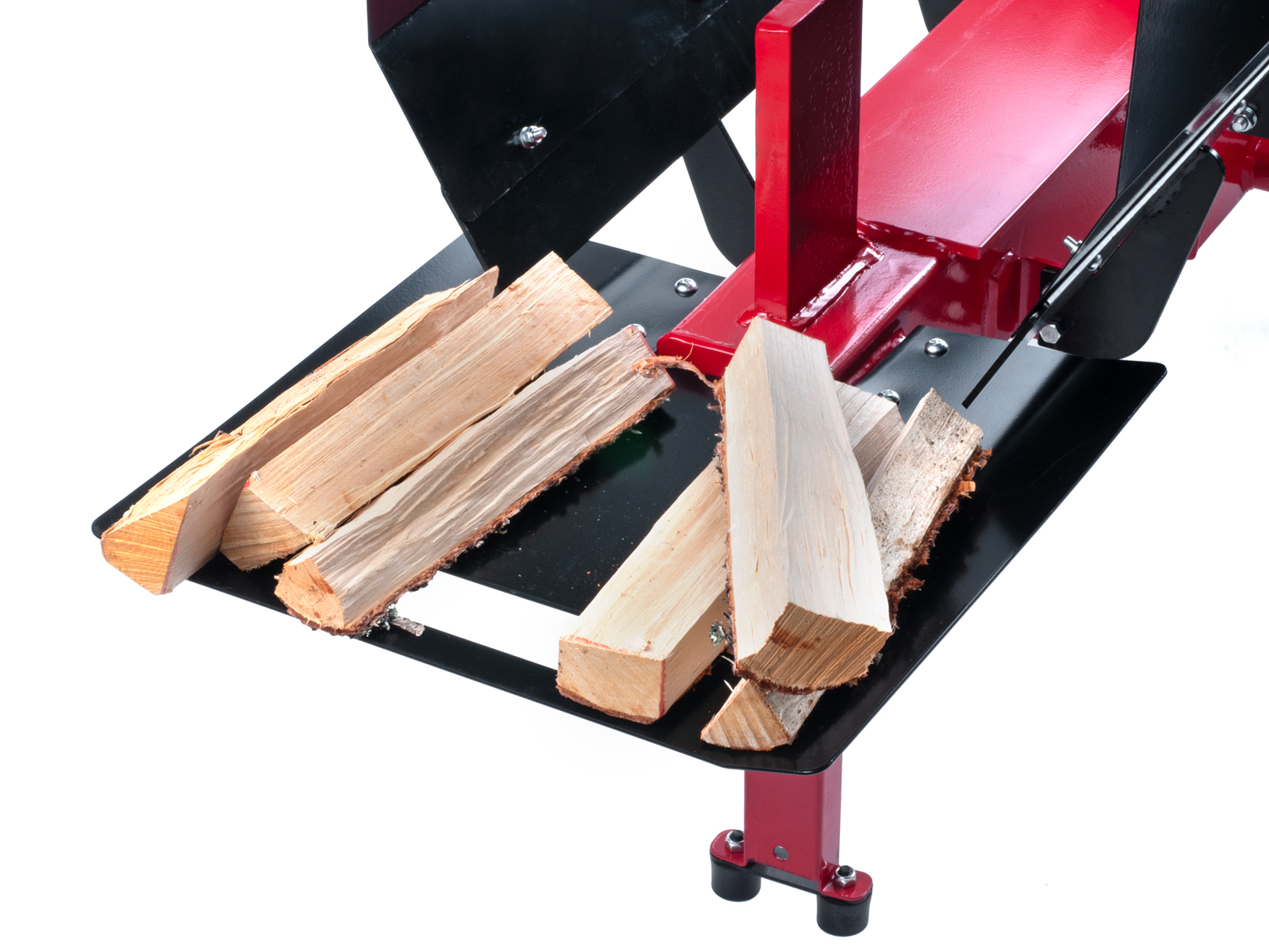 Sikkerheten er ivaretatt gjennom beskyttelsesbur rundt arbeidsbordet, samt med tohånds betjening av betjeningshendlene. Videre er vedkløyveren utstyrt med et oppsamlingsbord for ferdigkløyvet ved.