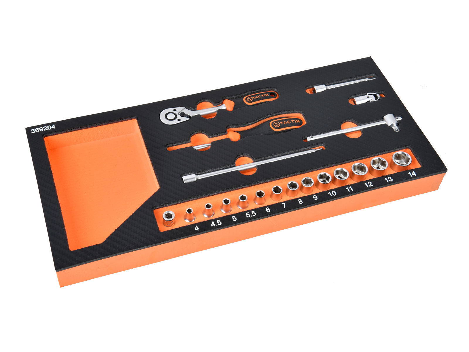 Verktøysett som gir deg enkel og ryddig organisering av dine verktøy. Med det to-fargede skuminnlegget ser du umiddelbart hvor verktøyet skal plasseres og om det er verktøy som mangler. Passer til Tactix skap. Størrelsen på settet er (BxL) 178x397 mm.