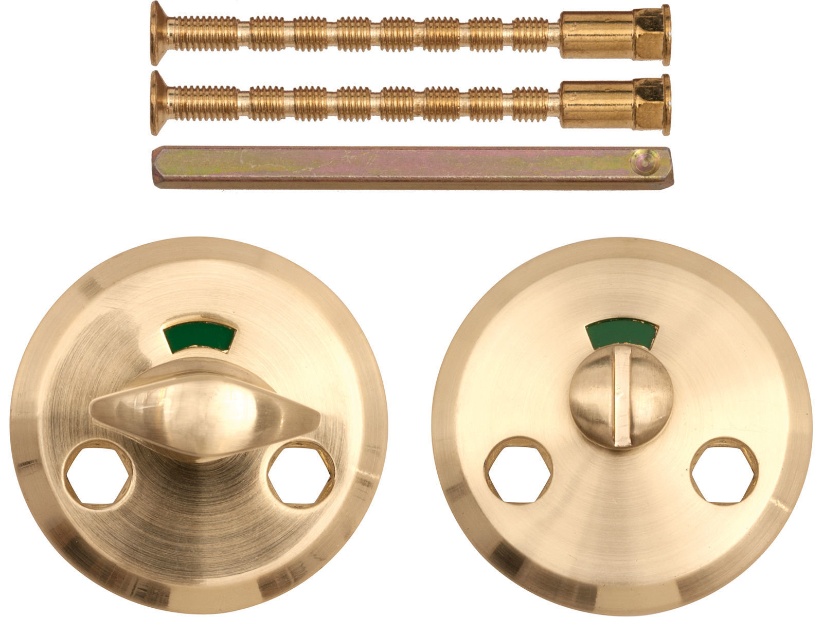 WC-garnityr av zink/alloy for innerdører. Messing utførelse. Passer til dørtykkelse 35-60 mm. Leveres komplett med skilt type R0K3, samt skruer og tilbehør. En del av BASIC-serien.