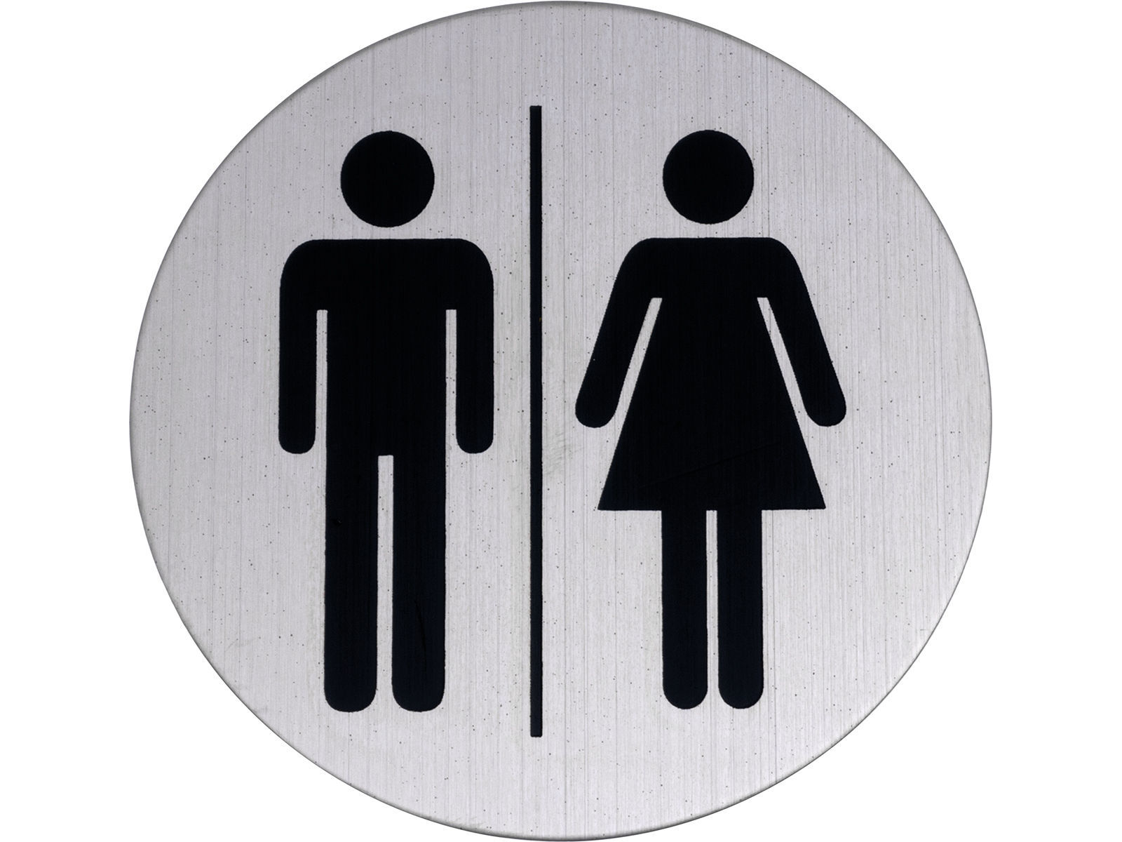 WC-skilt Ø75 mm i rustfritt stål (A2/304). Selvklebenede, fester godt til enhver plan og ren overflate. Tykkelse 1,5 mm.